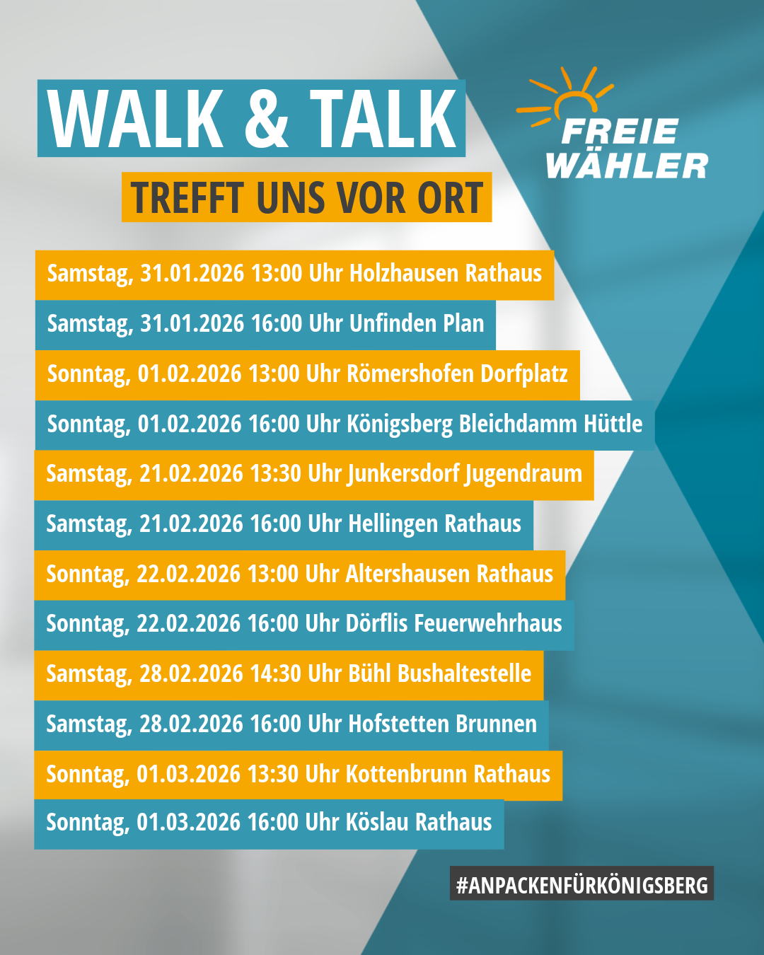 Ab Ende Januar gehen wir wieder los: Walk & Talk direkt bei euch in den Ortsteilen. Ohne Bühne, ohne lange Reden – dafür mit offenen Ohren. Lernt uns kennen, kommt mit uns ins Gespräch und erzählt uns, was euch bewegt. Wir hören zu.